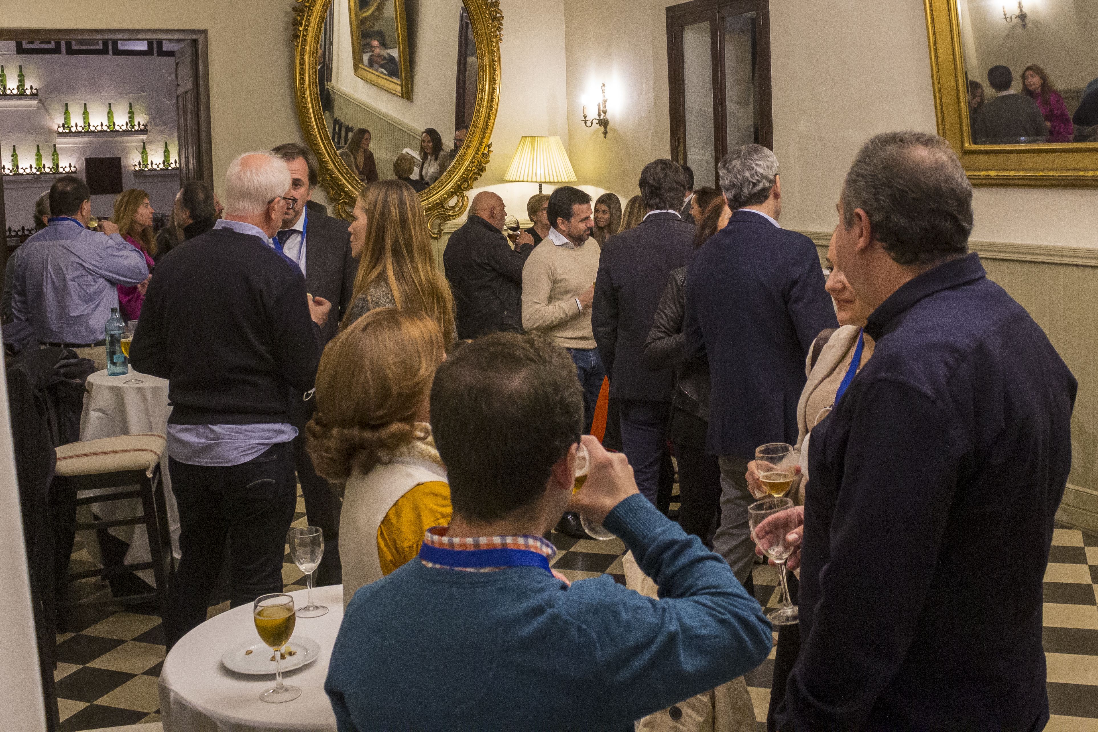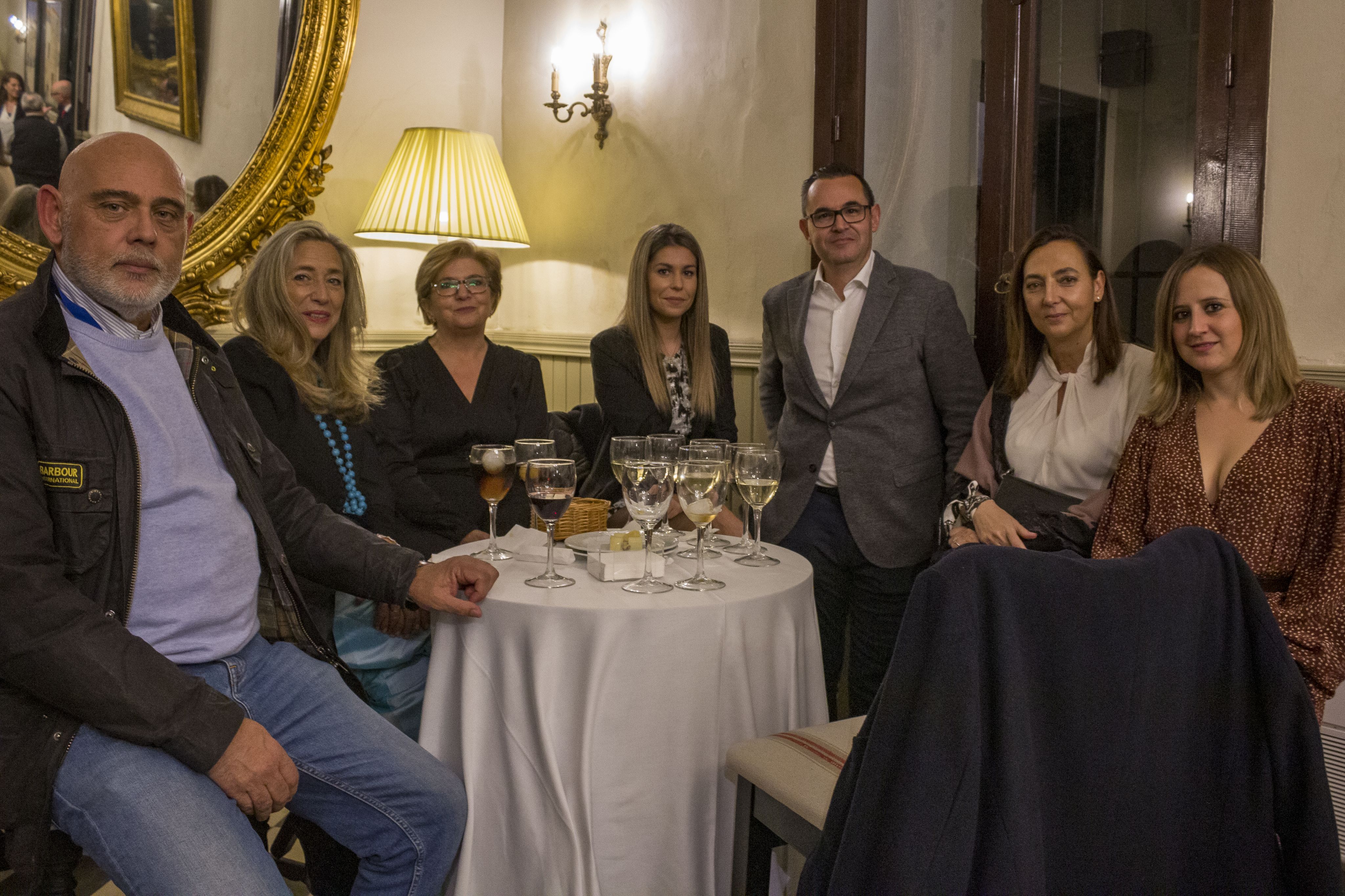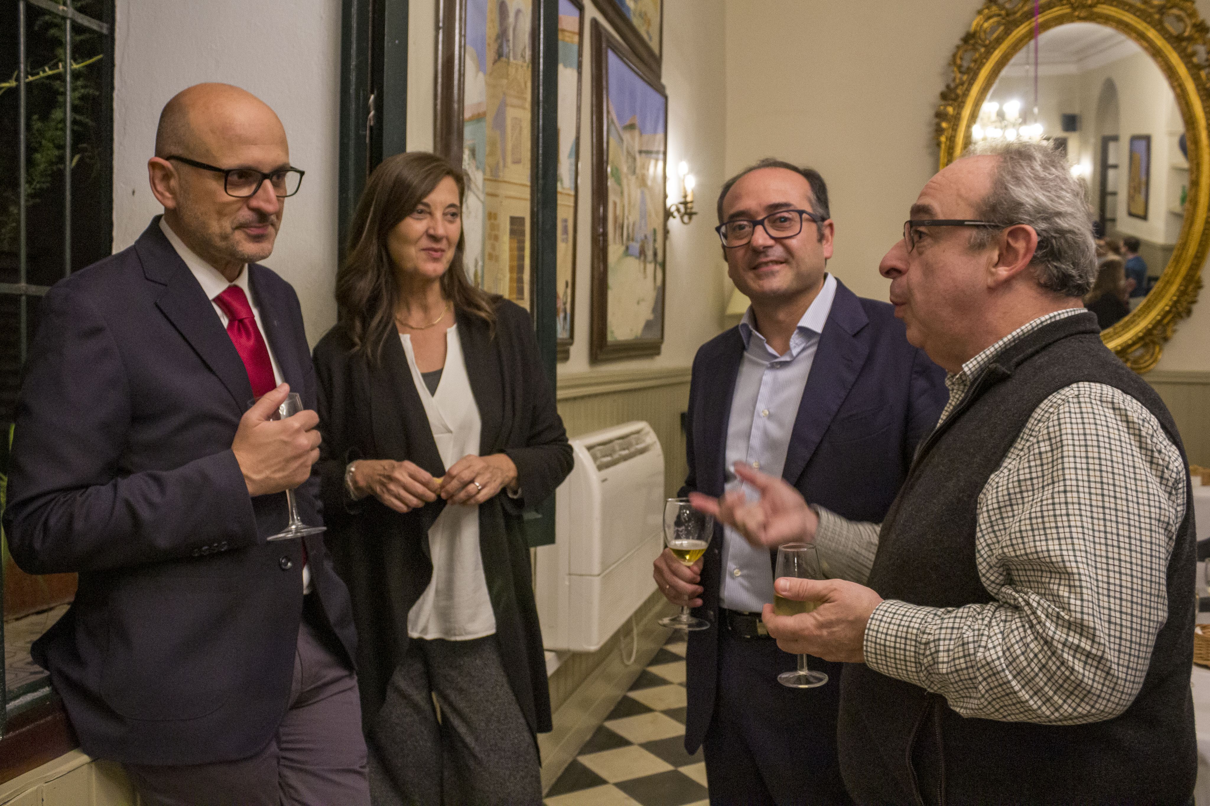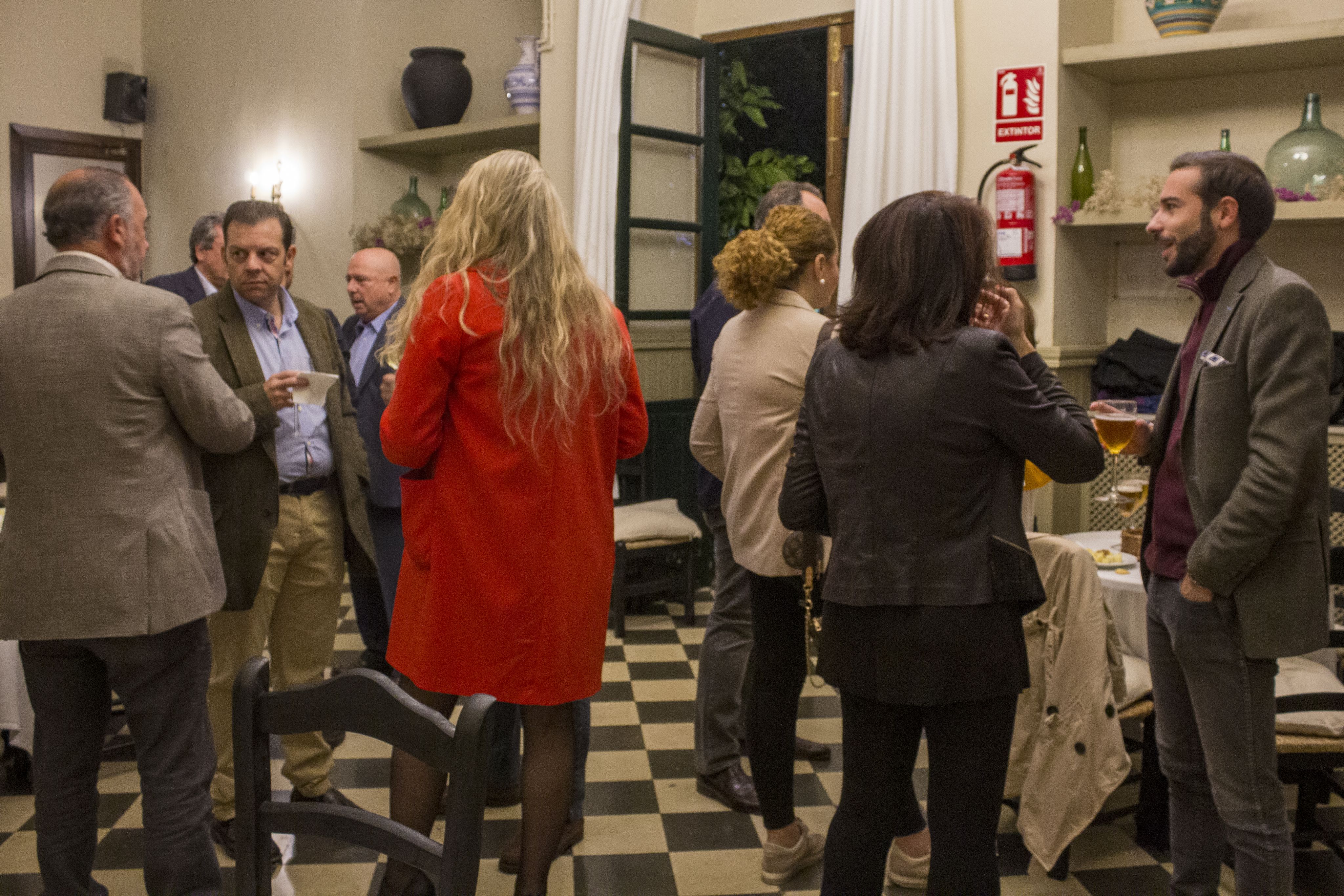 Conforme llegaban los asistentes fueron surgiendo de forma espontánea diferentes conversaciones ampradas por un ambiente distendido y jovial. La comida fue distribuida por camareros de la casa y entre otros platos destacamos las berenjenas fritas con miel de caña, el saquito de puerro y gambas, las croquetas de la casa, el mini quiche de beicon y cebolla caramelizada o el enrolladito de espárrago y jamón. Al igual que la comida de la mañana, la cena contó con una degustación de dulces tradicionales.