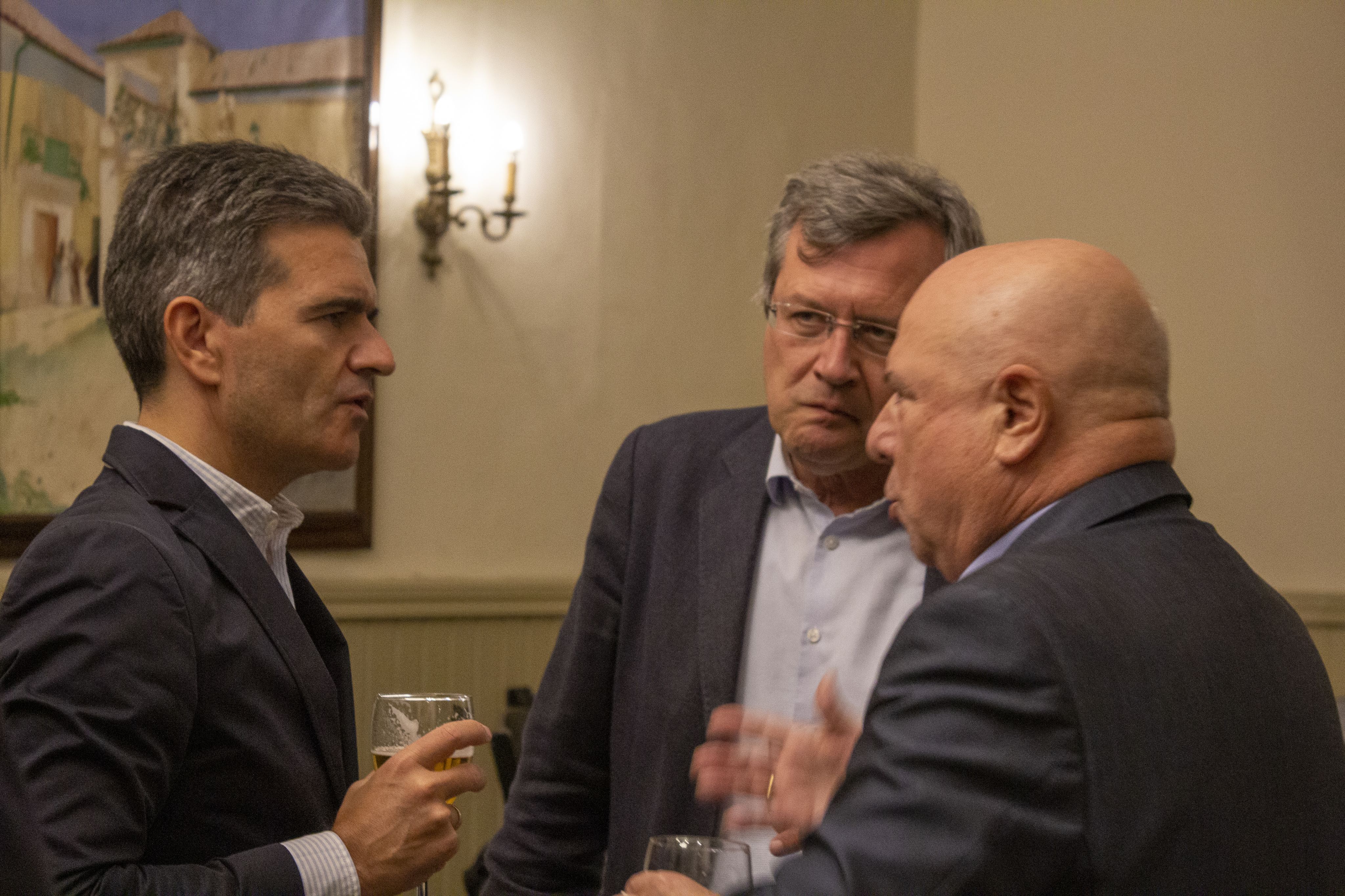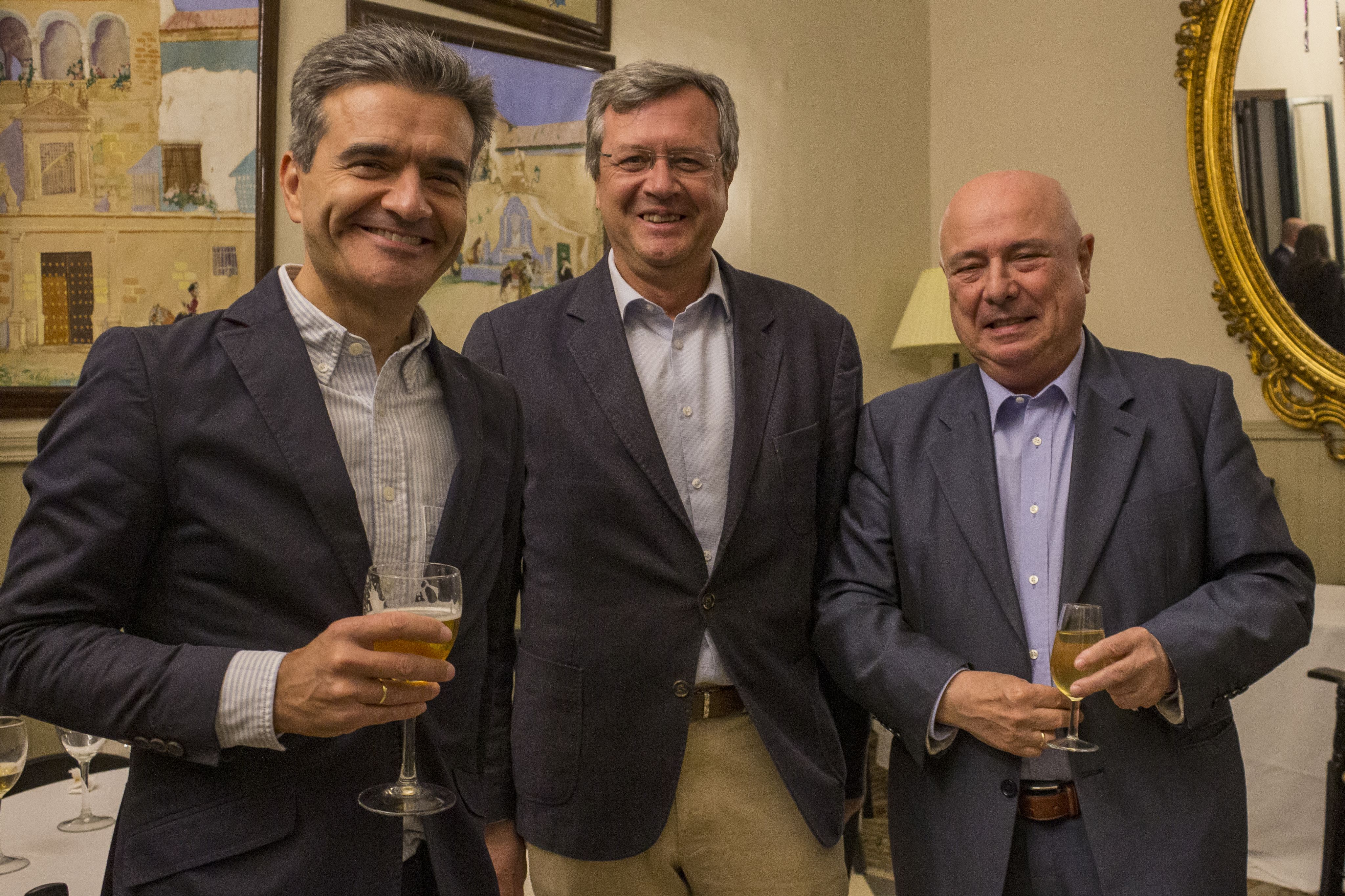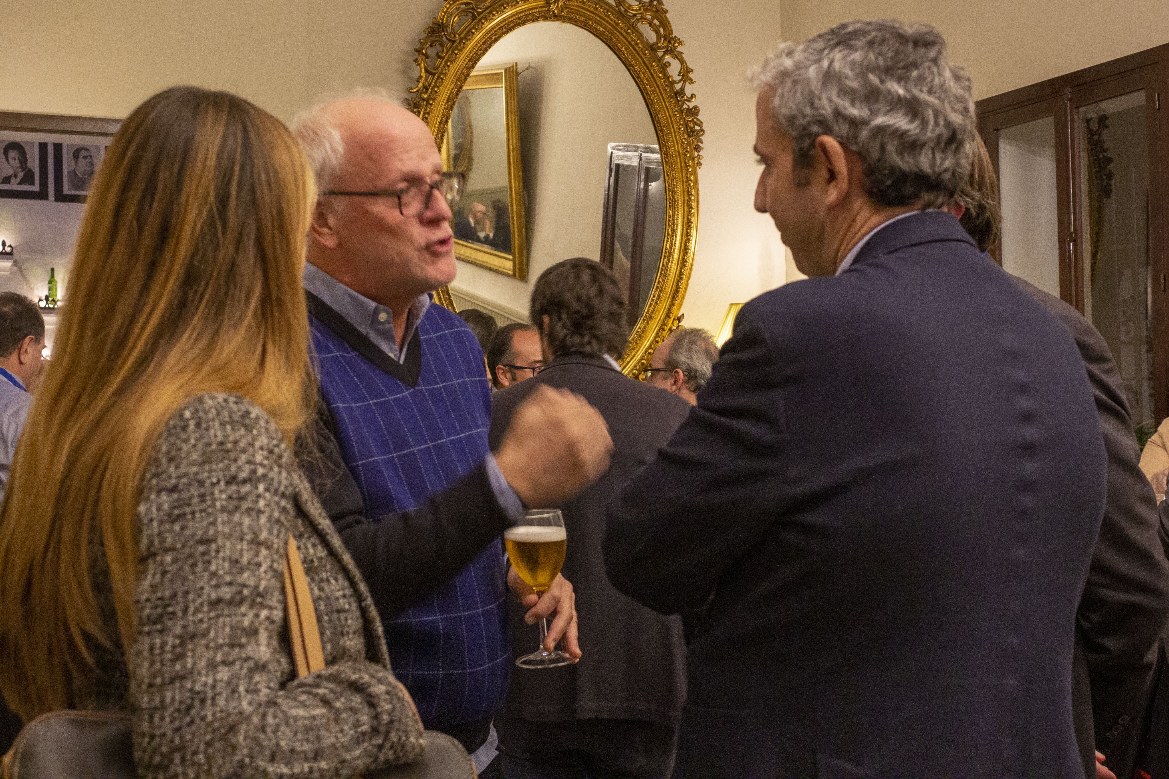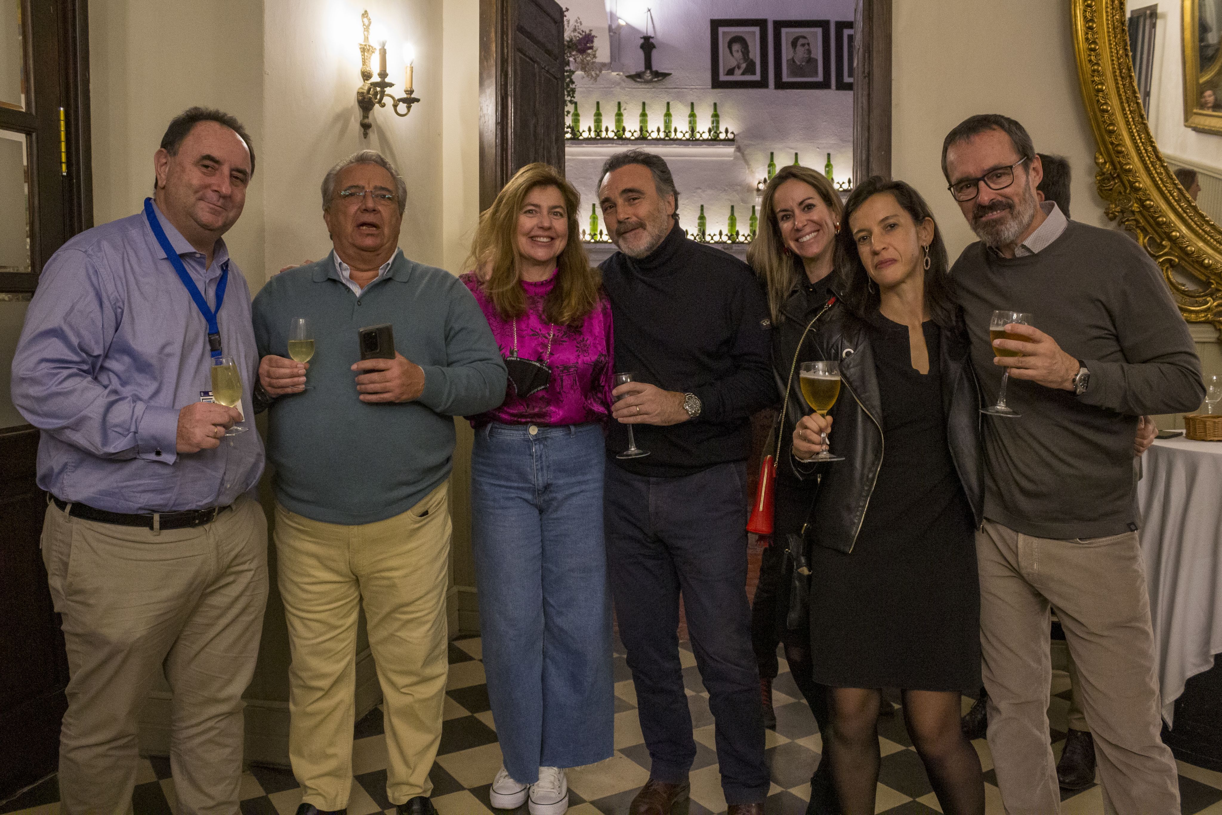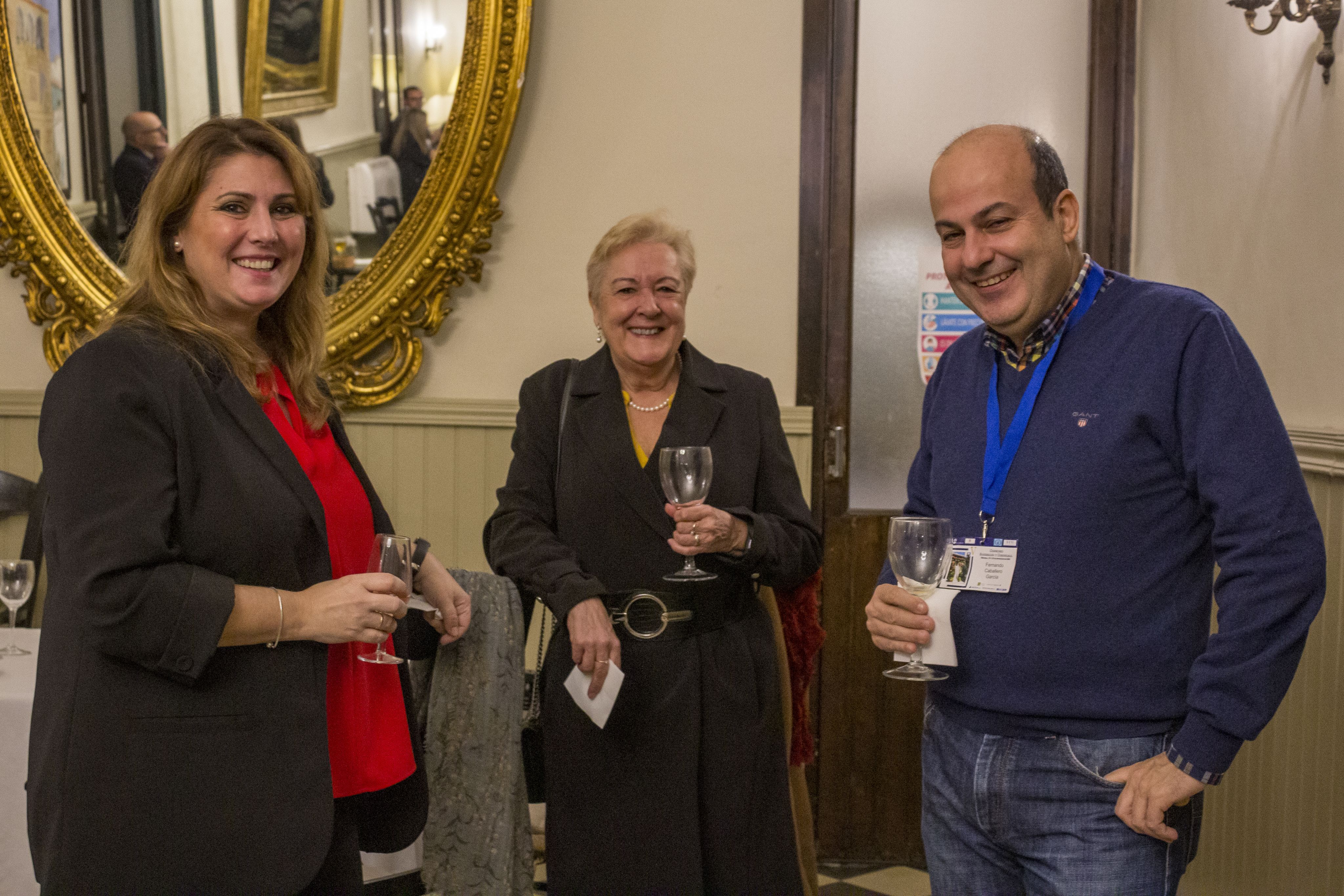 Conforme llegaban los asistentes fueron surgiendo de forma espontánea diferentes conversaciones ampradas por un ambiente distendido y jovial. La comida fue distribuida por camareros de la casa y entre otros platos destacamos las berenjenas fritas con miel de caña, el saquito de puerro y gambas, las croquetas de la casa, el mini quiche de beicon y cebolla caramelizada o el enrolladito de espárrago y jamón. Al igual que la comida de la mañana, la cena contó con una degustación de dulces tradicionales.