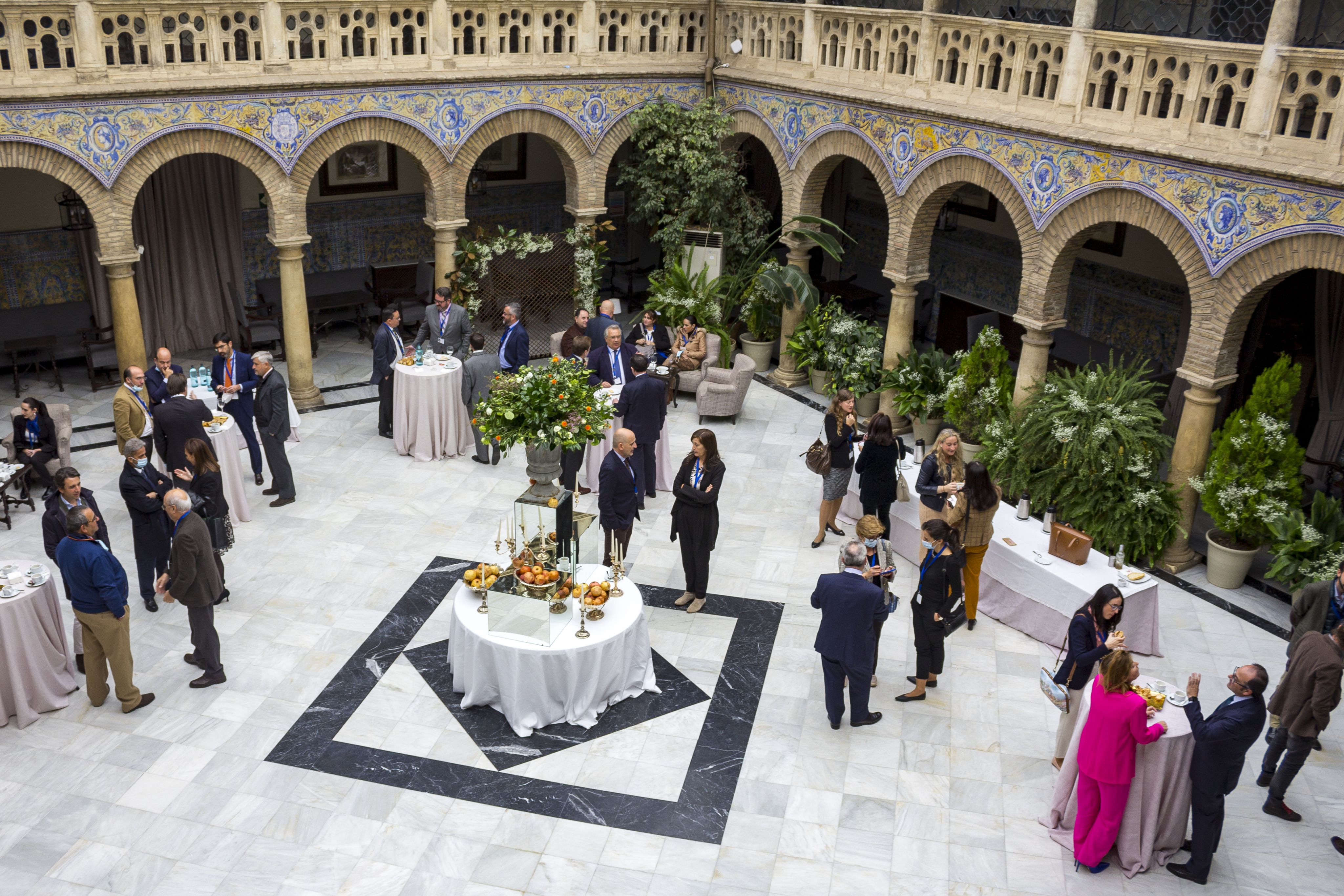 Después de una mañana tan intensa, los asistentes se dirigieron al número veintidós de la calle Rey Heredia, donde se ubica un ejemplo del típico patio cordobés. Allí, entre pórticos y macetas azules con flores de colores se desarrolló el almuerzo buffet, una nueva ocasión para dedicar al networking y al disfrute de uno de los rincones emblemáticos de la ciudad de San Rafael. Sin embargo, no fue únicamente ese ambiente alegre de los Patios de Córdoba el que caracterizó a la comida, sino que también sorprendió a los presentes la cata de vino fino con denominación de origen Montilla-Moriles venenciada por Bodegas “Lagar El Monte”. El almuerzo estuvo compuesto por diferentes tapas, tales como ibéricos, tabla de quesos, salmorejo cordobés, ensaladilla, bolitas de foie o rabo de toro en cazuela. Como broche final, se ofreció una variedad de postres.